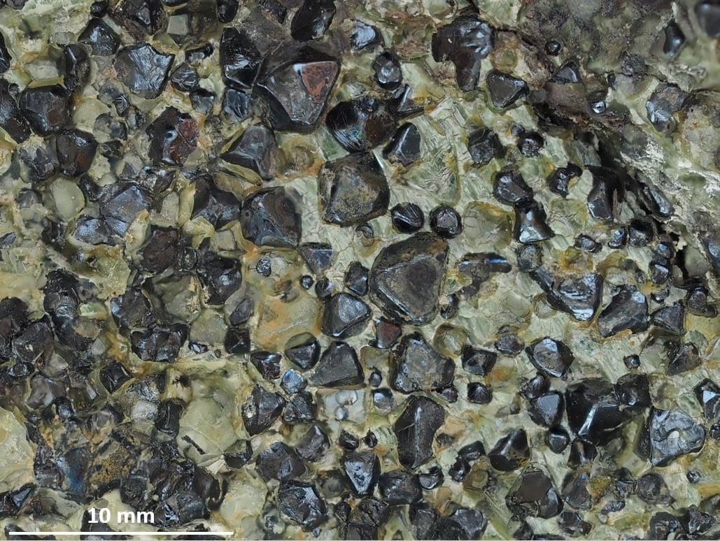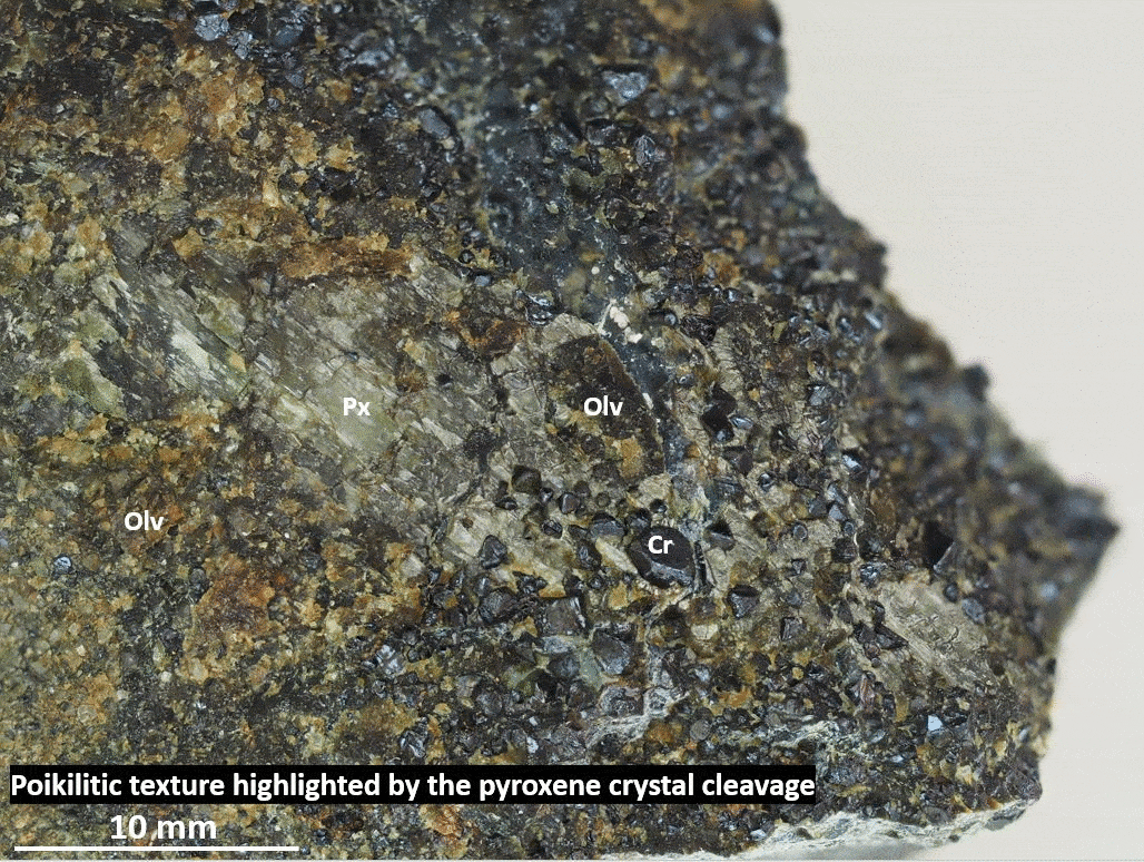 Mais au premier coup de marteau je me rends compte que cette chromite est très particulière. Cet échantillon est remarquable du fait de l’abondance de cristaux automorphes, très rares pour ce spinelle. Ces cristaux octaédriques ont été figés dans des gros cristaux de pyroxène à la texture poecilitique.